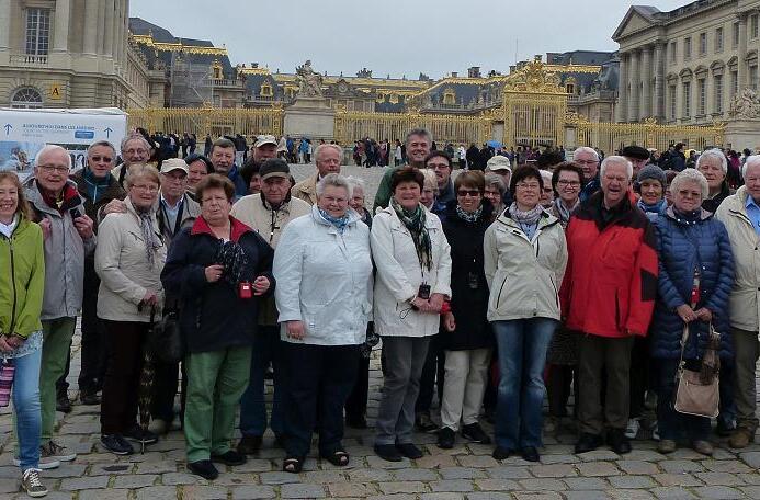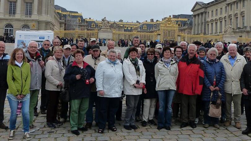 Auch heuer war der Jahresausflug des CSU-Ortsverbands Markt Einersheim, den in bewährter Weise Gaby und Hermann Böhm organisiert hatten, eine Attraktion. Die 42 Markt Einersheimer und Gäste erlebten sechs Tage in Frankreich, die sie nach der Ankunft im über 2000 Jahre alten Reims mit der Besichtigung der Kathedrale und anderen Sehenswürdigkeiten starteten. Danach erkundeten sie die Champagner-Anbaugebiete, wobei Weinproben nicht fehlen durften, heißt es in der Mitteilung. Der dritte Tag führte auf Einladung von Nikolaus Knauf nach St. Soupplets, wo die Reisegruppe das Knauf-Werk besichtigte. Diesem technischen Höhepunkt folgte die erste Stippvisite nach Paris. Dort genossen die Reisenden vom 210 Meter hohen Hochhaus Montparnasse hinunter den Blick auf die französische Hauptstadt. Ein Reisetag war Versailles gewidmet, wo das Schloss mit den bekannten Wasserspielen im Mittelpunkt stand. Die Reisenden waren überwältigt von den vielen Eindrücken. Das Bild zeigt die Reisegruppe vor dem Schloss Versailles. Foto: Margit Melber