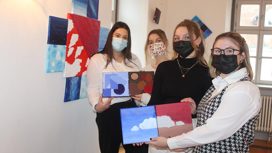 Bei den Bildern stehen die Farben blau (für Romanik) und rot (Barock) im Mittelpunkt. In Acryl, aber auch in Öl, wurden rund 40 Bilder in verschiedenen Größen gemalt. Sie zeigen sehr facettenreich einzelne Details aus den beiden Kirchen. In Wiesentheid fotografierten die jungen Künstler im Vorfeld dazu etliche Stellen, meist Ornamente, in der Mauritiuskirche, um sich dann einige zum Malen auszusuchen.