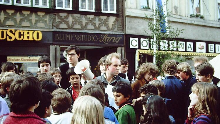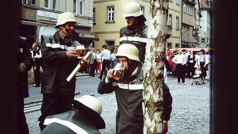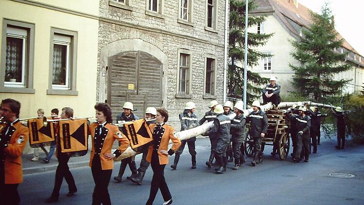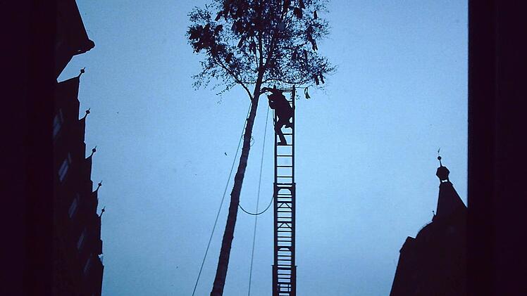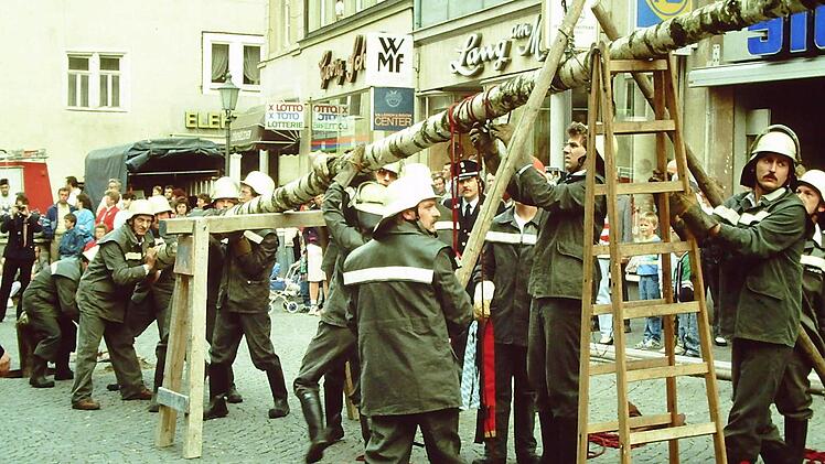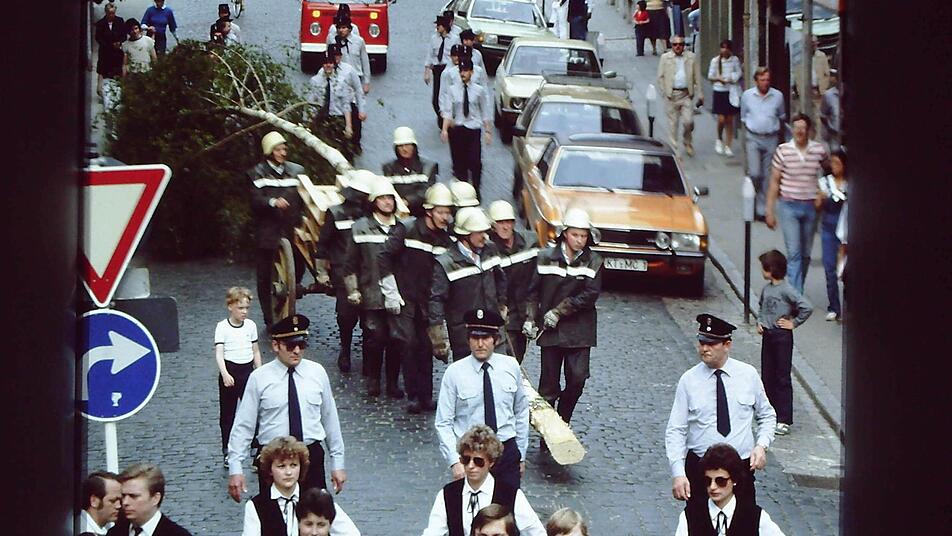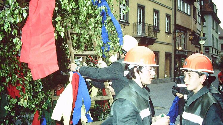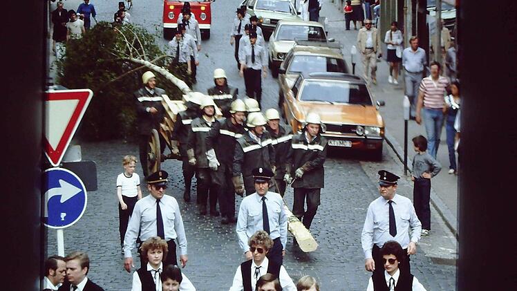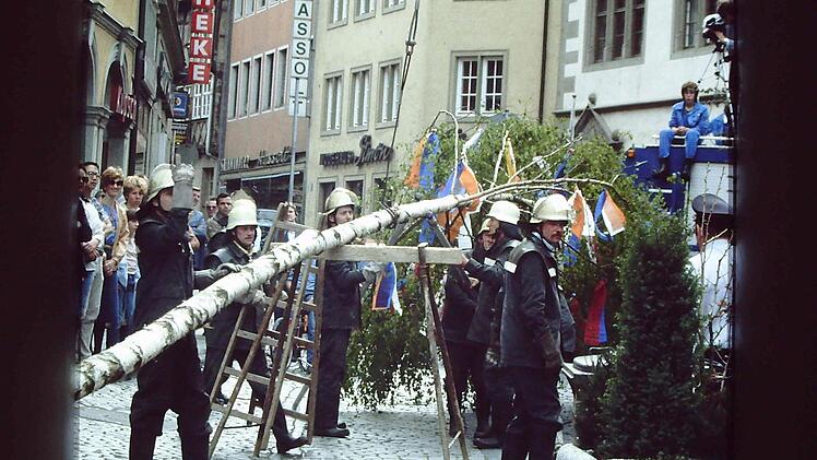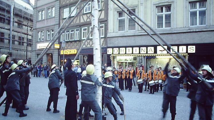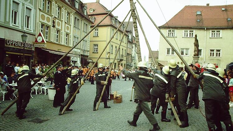 Der heutige Ehrenkommandant der Kitzinger Feuerwehr hat Anfang der 1980er Jahre darauf gedrängt, dass in der Weinstadt am Main ein Maibaum aufgestellt wird, ähnlich wie in vielen Orten der Umgebung. Damals konnte man in Kitzingen noch mit dem Auto über den Marktplatz fahren. Meistens jedenfalls. Am 30. April 1981 war das Stadtzentrum allerdings den Fußgängern vorbehalten. Und einem schön geschmückten Holzkarren, auf dem die Feuerwehrleute Kitzingens allerersten Maibaum in einem feierlichen Marsch ins Zentrum beförderten.