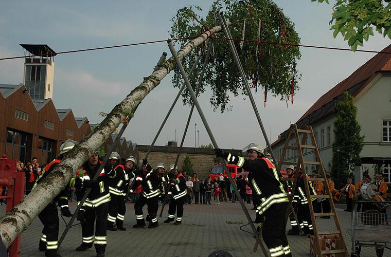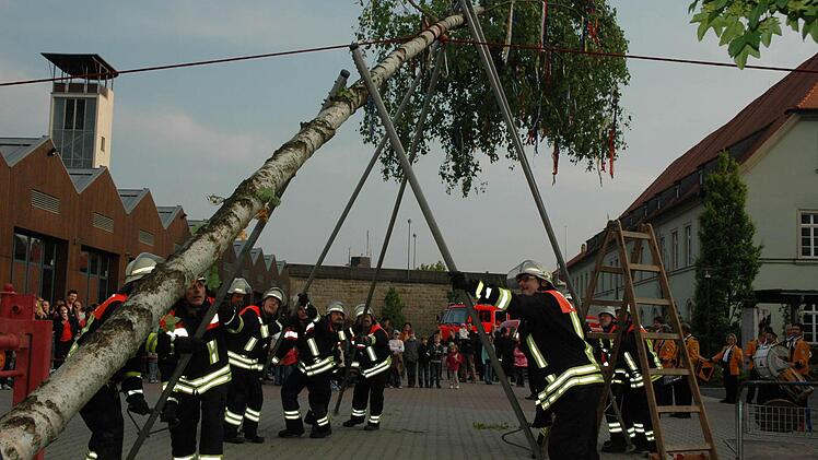 Auch wenn das heute nicht mehr "in" ist: Das Maibaum-Aufstellen ist ein festliches Ereignis mit Tanz, Gesang und Musik geblieben. Damit die Freude lange währt, haben viele Festveranstalter Vorkehrungen getroffen. Die Freiwillige Feuerwehr Kitzingen zum Beispiel stellt den von der Jugendwehr geschmückten Baum wie eh und je mit so genannten Schwalben auf - das sind je zwei Stöcke aus Holz oder Alu, die mit Stricken verbunden sind und mit denen FFW-ler den Baumstamm in die richtige Position bugsieren. Danach wird mit dem Publikum gefeiert.