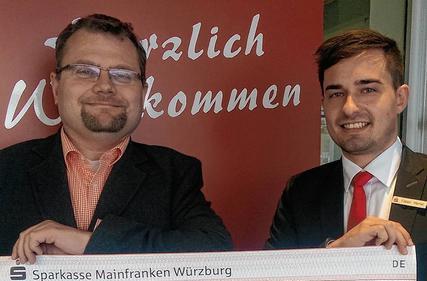 Die Marktgemeinde Wiesentheid bekam eine Spende über 1500 Euro von der Sparkassenstiftung für die Stadt und den Landkreis Kitzingen. Davon wird der Mehrgenerationenplatz in der Kolpingstraße mit einem HC-Spieltisch ausgestattet, so die Mitteilung an die Presse. Der stellvertretende Sparkassen-Geschäftsstellenleiter Fabian Mantel (rechts) überreichte den Scheck an Bürgermeister Werner Knaier. Foto: HANNA FLAMMERSBERGER