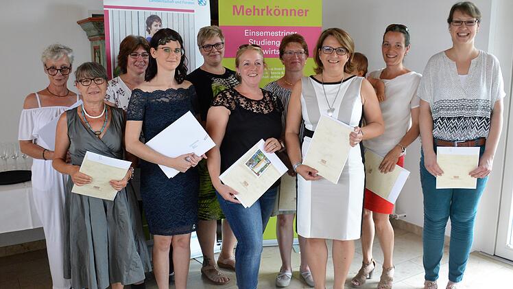 Die weiteren Absolventinnen: Nadja Endrich (Kitzingen), Barbara Etienne-Sattes (Seinsheim), Heike Gistel-Schömig (Schwarzach), Sibylle Haenitsch-Weiß (Obernbreit), Franka Hein (Kitzingen), Melanie Horak (Rottendorf), Sandra Lorenz (Marktsteft), Carina Moik (Markt Einersheim), Beate Müller (Buchbrunn) und Susanne Pfarr (Biebelried).