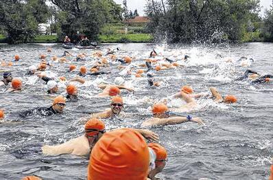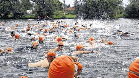 Dazu kommen sehr schnelle Zeiten beim Schwimmen, weil mit der Strömung geschwommen wird. Die Ersten auf der langen Strecke dürften die 1600 Meter bereits nach 12 Minuten hinter sich gelassen haben und die besten Teilnehmer am Volkstriathlon steigen nach sechs oder sieben Minuten wieder aus dem Wasser, um sich aufs Rad zu schwingen, weiß Göpfert.