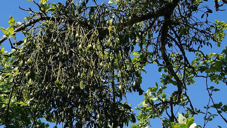 Betroffen sind auch Bäume im Landkreis Kitzingen: „Bei uns breiten sich Misteln relativ stark im Streuobstbestand aus, vor allem wenn die Bäume nicht mehr geschnitten werden“, meint Fachberater Riehl. „In die hohen Bäume will niemand rauf. Da können sich die Misteln festsetzen.“Haben die Samen der Halbparasiten einmal Fuß gefasst, dringen ihre Saugwurzeln durch die Rinde in den Baum ein und entziehen der Wirtspflanze Wasser und Nährstoffe. Die für ihr Wachstum benötigte Energie gewinnt die Mistel dann über ihre Blätter mittels Photosynthese. „Misteln können sehr große Büsche werden und schwächen die Bäume“, erklärt Riehl. Dies gelte insbesondere, wenn sie bereits durch Trockenheit, Pilze oder Krankheiten angeschlagen sind.