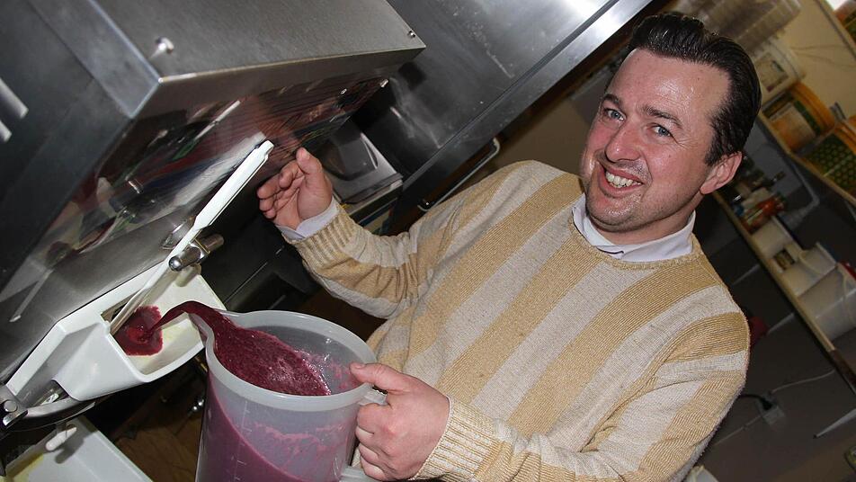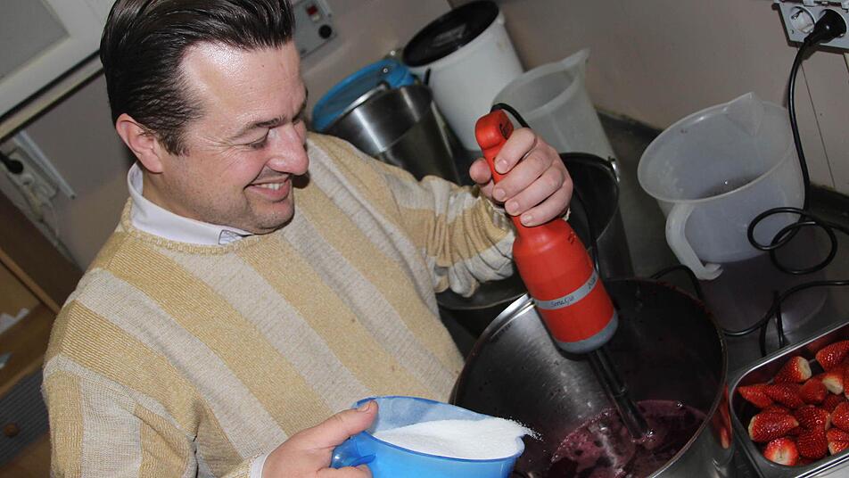 Er fügt ein paar Spritzer Zitronensaft hinzu. In einem anderen Gefäß mischt er Zucker, ein geschmacksneutrales Bindemittel, das aus Kastanien gewonnen wird, und "gutes Kitzinger Wasser" zusammen und gibt das Ganze zum Erdbeerpüree.
