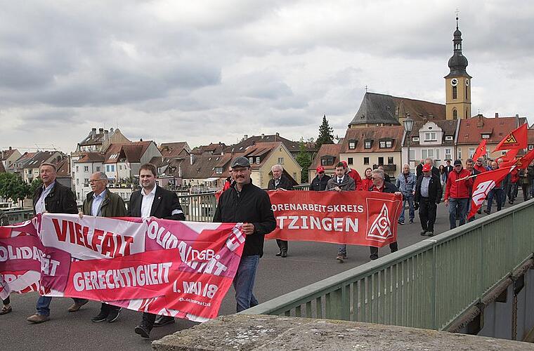 Zuvor aber, auch das hat Tradition in Kitzingen, versammelten sich gut 50 Teilnehmer auf dem Kitzinger Marktplatz, um mit Fahnen und Transparenten über die Alte Mainbrücke bis nach Etwashausen zu ziehen. Dort angekommen, empfing sie im Versammlungsort die Knauf Bergmannskapelle. Unter den Teilnehmern auch Landrätin Tamara Bischof und Kitzingens stellvertretender Bürgermeister Klaus Heisel.