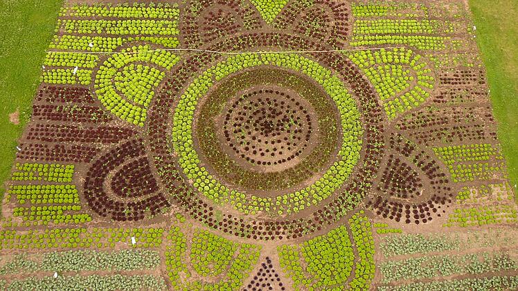 Rund sechs Wochen davor haben etwa 20 Helferinnen und Helfer die Salatblume mit den Sorten Kopfsalat, Eichblatt, Lollo-Rosso, Salanova, Endivie, Batavia und Eissalat angepflanzt, heißt es in der Mitteilulng. Innerhalb kurzer Zeit hatte das eingespielte Team die rund 10 000 Pflanzen „verarbeitet“. Zwischen der Salatblume und den vielen Sonnenblumen wurden zusätzlich Blaukraut, Wirsing, Weißkohl und Grünkohl für den Wagenschmuck beim Kirchweihumzug am 14. Oktober gepflanzt. Die „künstlerische Leitung“ der Salatblume hatte wieder Hans Hummel.