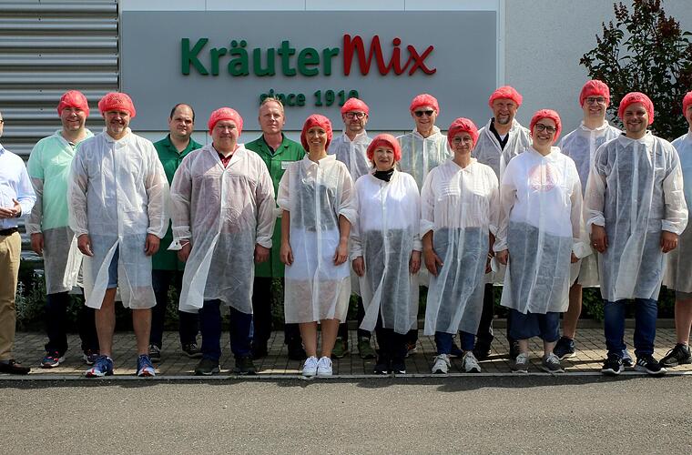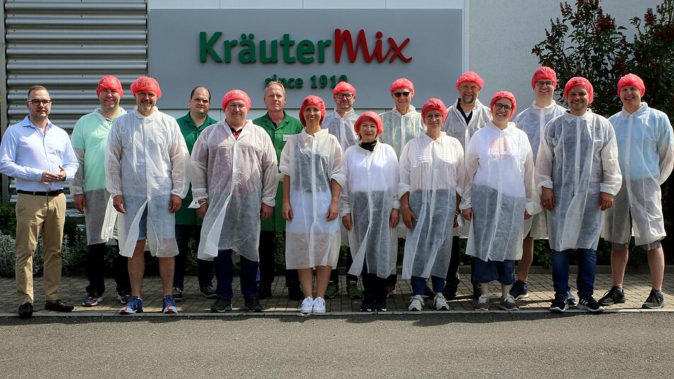 Wie wird eigentlich eine Teemischung hergestellt? Wo kommen die Gewürze her, die wir in unser Essen streuen? Und warum riecht es auf der Autobahn zwischen Wiesentheid und Geiselwind nach Kräutern? Antworten auf diese Fragen bekamen Mitarbeiterinnen und Mitarbeiter der Sparkasse Mainfranken Würzburg bei einer Betriebsbesichtigung der Firma Kräuter Mix in Abtswind. Der Besuch war Teil einer Teamentwicklung für Führungskräfte des Finanzinstituts. Doch bevor die Gäste hinter die Kulissen schauen und schnuppern durften, mussten sie sich – wie in einem Lebensmittelbetrieb üblich – mit einem Schutzmantel und einem Haarnetz einkleiden sowie die Hände waschen und desinfizieren.