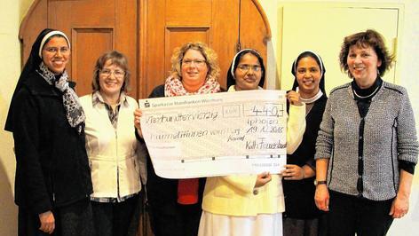 Durch den Verkauf von Kaffee und Kuchen am Iphöfer Weihnachtsmarkt erwirtschaftete der katholische Frauenbund Iphofen laut einer Pressemitteilung einen „ansehnlichen Betrag“. Der Erlös wurde aufgestockt und je 440 Euro gehen an drei soziale Einrichtungen. Eine Spende erhalten die Karmelitinnen für ein Projekt in Indien. Frauen lernen nähen und erhalten dazu eine Nähmaschine. Auch die Mallersdorfer Schwestern wurden mit einer Spende für ihre Sozialarbeit in Rumänien bedacht. Dort unterhalten sie einen Kindergarten für etwa 100 Kinder aus sozial schwachen Familien und ein Haus für behinderte Kinder und Erwachsene. Mit einer dritten Spende wurden die Klinikclowns Lachtränen in Würzburg unterstützt. Sie besuchen kranke Kinder im Krankenhaus oder alte Menschen im Seniorenheim, um mit ihnen Zeit voll Spaß und Freude zu verbringen. Das Bild zeigt die Spendenübergabe an die Karmelitinnen aus dem Altenbetreuungszentrum Iphofen (von links): Oberin Schwester Merin, Maria Scheller, Eva Häufglöckner, Schwester Pavitra, Schwester Justina und Barbara Keppler. Foto: Klaus Scheller 1#googleAds#100x100