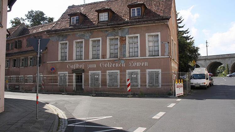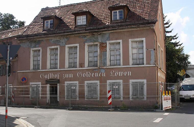 Das ehemalige, seit Jahren leer stehende Wirtshaus "Goldener Löwe" ist schon lange ein Sorgenkind der Stadt. An augenfälliger Stelle gelegen - direkt am Stadteingang nahe des Viaduktes - verfällt es zunehmend. Ein Bauzaun schützt die Passanten vor möglichen Gefahren, die von der Ruine ausgehen.
