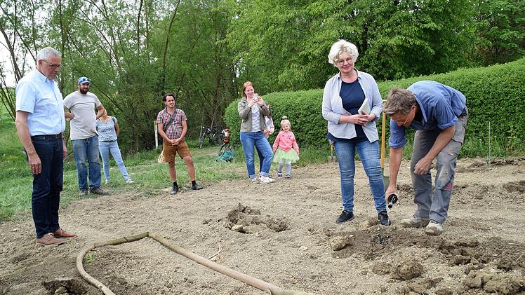 Dieter Gottschalk ist eigentlich Restaurator im Fränkischen Freilandmuseum in Bad Windsheim. Doch an der Landesanstalt für Wein- und Gartenbau in Veitshöchheim hat er eine Ausbildung nun zum Winzer abgeschlossen. "Das meiste habe ich bei Christian Ehrlich gelernt", lobt Gottschalk den Rödelseer Winzer, in dessen Betrieb er die Praxis erlebte. Klar, dass Christian Ehrlich beim Pflanzen dabei war, wie auch Miriam Kutschenreiter und Tobias Denisch, die zusammen mit Gottschalk die Ausbildung absolviert hatten. "Sobald der Erste seinen Weinberg anlegt, ist die Aufregung groß", verriet Miriam Kutschenreiter.