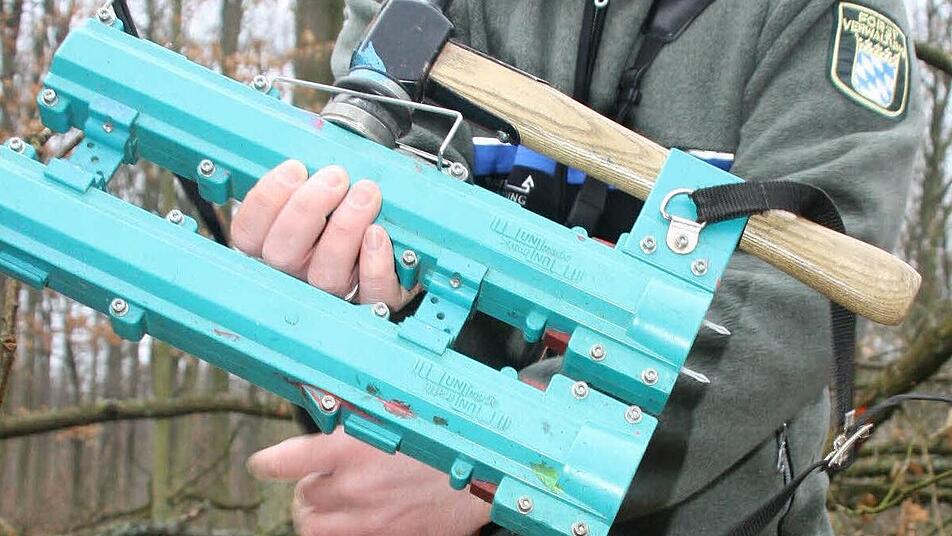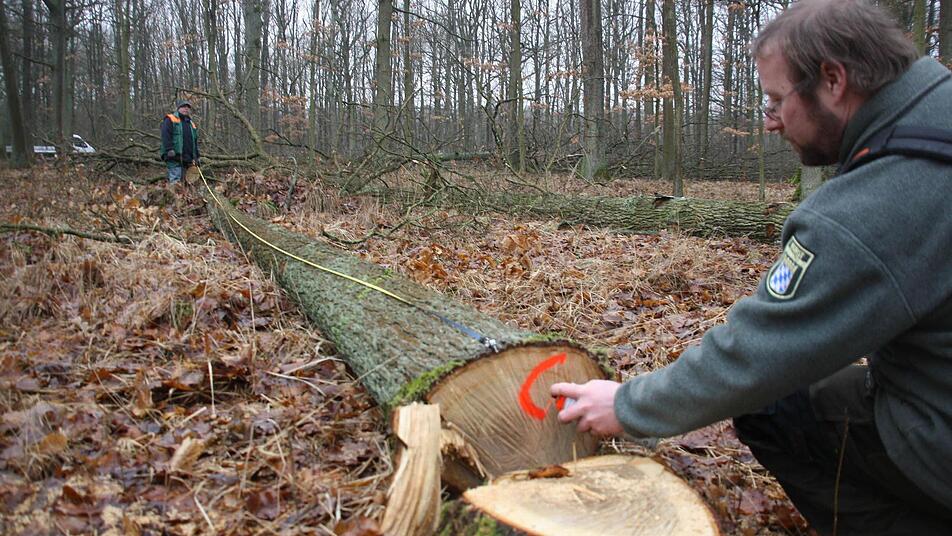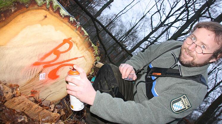 Doch wer beurteilt eigentlich, was wertvolles Stammholz ist - und was Brennholz? Achim Volkamer deutet auf einen Berg aus gefällten Bäumen. Zusammen mit Bastian Hartner und dessen Kollegen Bajram Demirezen nimmt der Segnitzer jeden Stamm unter die Lupe, um die Qualitätsstufe festzulegen. Ausschlaggebend sind nicht nur Stärke und Wuchs. Volkamer lässt den geschulten Blick auch über Markröhre, Jahresrin gaufbau, Holzfarbe und den "Splint" - den Bereich unter der Rinde - streifen. Dann implantiert er dem Stamm per Hammer schlag ein Nummernplättchen und schreibt mit der Sprühdose sein Qualitätsurteil nebendran. Die meisten Stämme bekommen ein B oder C, manche werden auch als halb-halb (B/C) bewertet - "ausgehalten", heißt es in der Förstersprache. "Man muss da genau sein. B bringt doppelt bis dreifach so viel ein wie C." Die Holzrücker transportieren die Stämme schließlich ab.