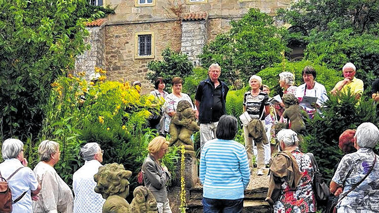 Aufmerksdam lauschten rund 50 Besucher im Puttengarten auf dem Schwanberg Monika Conrad, die die Führung leitete. Sie verlas zunächst eine Beschreibung von Putten, die auf der Balustrade des Rokoko-Gartens Veitshöchheim stehen. Sie wurden von Johann Peter Wagner (1730-1809), dem berühmten Hofbildhauer des Fürstbischofs Adam Friedrich von Seinsheim, gefertigt und gelten als die bedeutendsten Kinderfiguren des Rokoko.