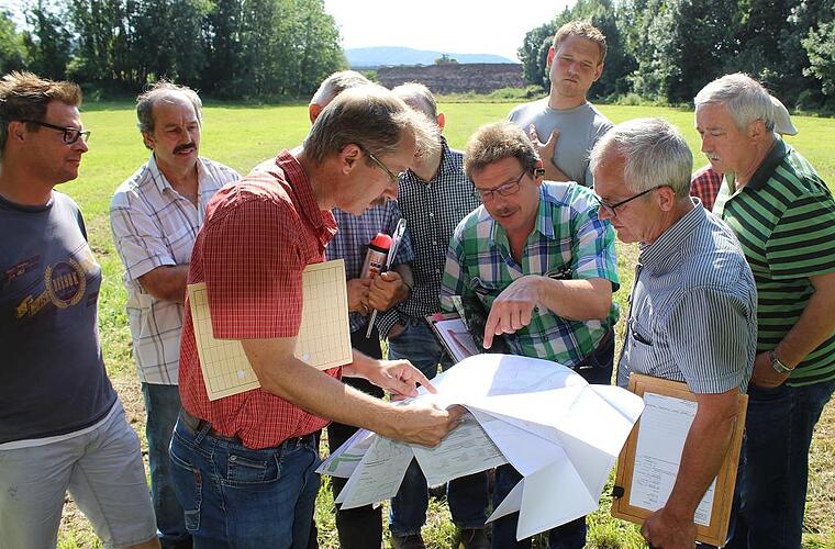 Einen Teil der Wiese Richtung Greuth, direkt vor der neuen Brücke der Umgehungsstraße, hatte Fachberater Robert Grömling vom Verband für Ländliche Entwicklung zum Ortstermin bereits mit kleinen Holzstöcken abgesteckt, um aufzuzeigen, wie nahe der Rückhaltebereich an das Wäldchen führen soll.