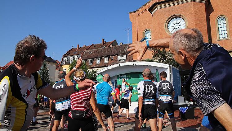 Die Teilnehmer der Tour genossen den Aufenthalt in Kitzingen. „Der Empfang war grandios, der beste überhaupt bisher“, lobte Teilnehmer Werner Konrad aus Burgthann das Spalier aus Weinprinzessinnen und Gardetanzgruppen. Zusammen mit Mit-Radlern hatte er es sich auf dem Festplatz gemütlich gemacht. „Das ist das erste Mal, dass wir richtig Platz haben“, sagte Herta Jaeger aus Buchschwabach bei Fürth. Die Konzerte an den Abenden zuvor seien regelrecht überfüllt gewesen.