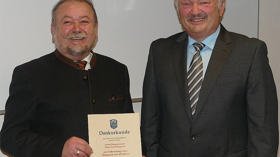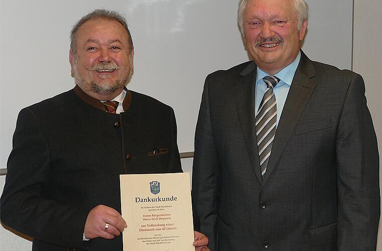 In einer Feierstunde im Sitzungssaal des historischen Rathauses würdigten Politiker und Mitarbeiter das 40-jährige Dienstjubiläum des Vorsitzenden der Verwaltungsgemeinschaft Marktbreit (VG) und Bürgermeister Erich Hegwein.