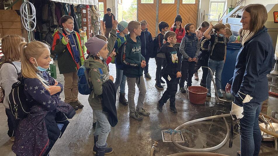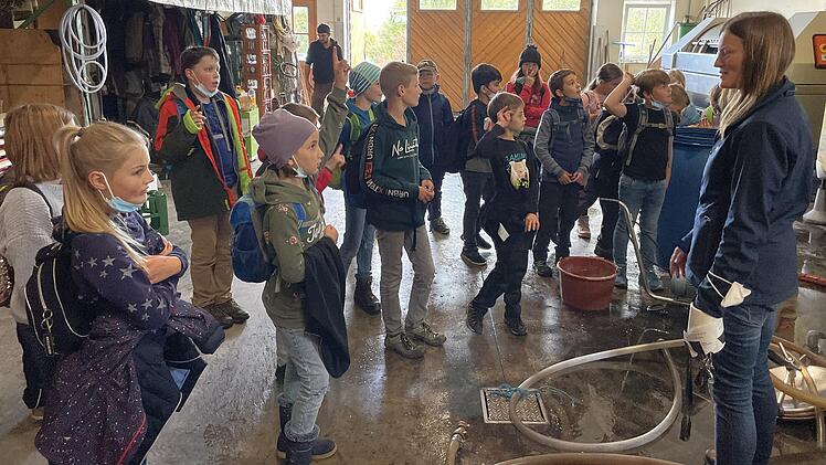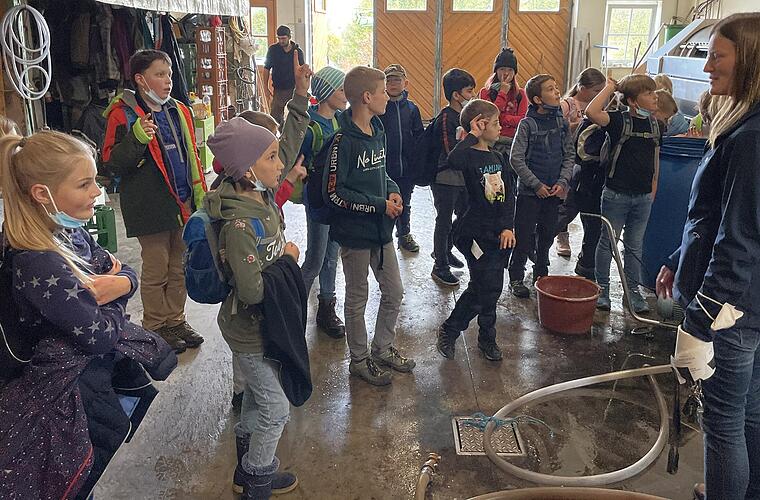 Nach der Erkundungstour durch die Weinberge durften wir zu Besuch bei dem Weingut Emmerich in Iphofen sein. Die Kinder lernten nicht nur, dass das Pressen der Weintrauben als Keltern bezeichnet wird, sondern bekamen an der Keltermaschine auch den Ablauf gezeigt. Frau Emmerich erklärte, dass die Pressrückstand der ausgepressten Trauben, wie die Schalen und Stiele, Trester genannt werden. Der Trester wird anschließend kompostiert und zum Düngen wieder in den Weinberg gebracht, da dieser viele nützliche Nährstoffe enthält. In der wohlverdienten Brotzeitpause durften die Viertklässler natürlich auch den frisch gepressten Traubensaft probieren. Dabei durften die Kinder selbst noch einmal den Zuckergehalt mithilfe der Mostgewichtwaage messen und dann den leckeren Saft genießen.