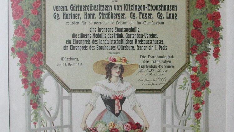 Heinrich Lang ist das Gesicht der Gartenbaugruppe mit ihren 70 Mitgliedern, steht er doch seit 1975 an deren Spitze. In Jahr seines Amtsantritts erlebte die Etwashäuser Gartenbaugruppe einen Höhepunkt ihres Bestehens, als sie den Bayerischen Gartenbautag in Kitzingen ausrichtete. Stolz waren die Etwashäuser Gärtner auch im Jahr 1914, wie eine Urkunde von der Unterfränkischen Jahrhundert-Gartenbauausstellung belegt. Denn die vereinten Gärtner Georg Lang, Georg Hartner, Konrad Straßberger und Georg Fexer bekamen von der Fachjury damals zwei Ehrenpreise, eine Landesverbands-Bronzemedaille und eine Bezirksverbands-Silbermedaille verliehen für herausragende Leistungen im Gemüsebau.