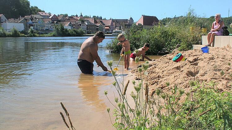 Neben dem Einstieg auf Sand können sich die Besucher auch auf die Natursteinterrasse setzen und die Beine im Wasser baumeln lassen. Zu viele werden es selten. „Dafür ist die Bucht zu klein“, sagt Bürgermeister Matthias Dusel und sieht sich weit entfernt von den Verhältnissen auf der anderen Mainseite.