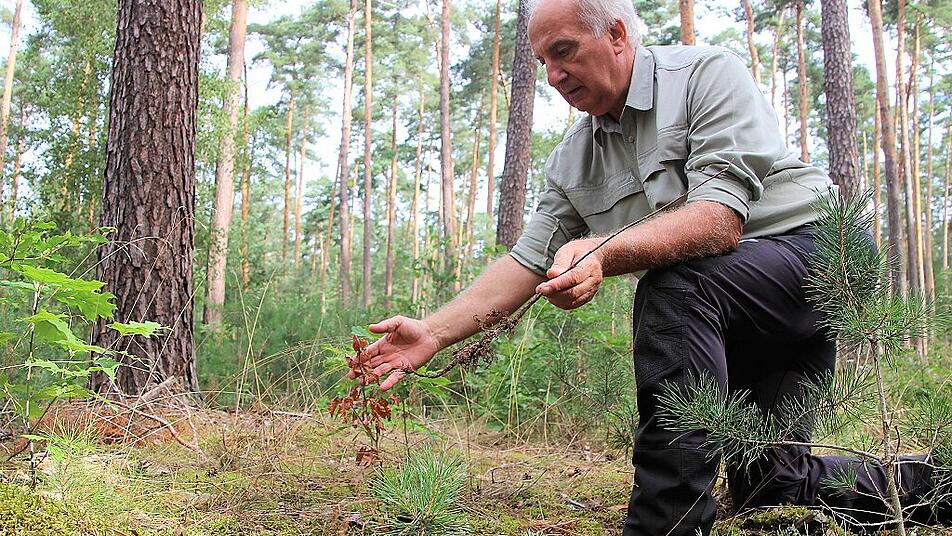Dass der Temperaturanstieg Veränderungen mit sich bringen wird, ist seit langem klar, die Geschwindigkeit dieser Veränderungen aber überrascht die Fachleute. „Wir arbeiten seit Jahren intensiv und vorausschauend am Waldumbau hin zu klimatoleranten Waldgesellschaften“, betont Behr, während er ein eingezäuntes Areal im Gemeindewald Wiesentheid ansteuert. Innerhalb des Zaunes erreichen junge Eichen schon Schulterhöhe. Außerhalb finden sich keine Sprösslinge größer als 20 Zentimeter. „Alle Eichen, die nicht eingezäunt sind, werden immer wieder vom Rehwild verbissen.“