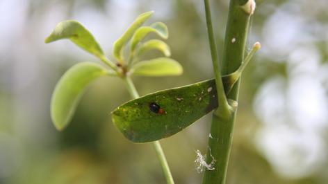 Die filigrane Florfliege mit ihren durchsichtigen Flügeln und dem langgezogenen, grüngelben Körper wird bis zu vier Millimeter groß und ist damit ein Riese unter den Nützlingen. Ihre Leibspeise sind Blattläuse. „Das macht sie zu unserem Verbündeten“, stellt Volker Kronmüller fest. Gerade im Sommer gibt es viele Faktoren, die eine Ausbreitung von Schädlingen begünstigen können: ein nicht ganz passender Standort, falsche Gießpflege, zu hohe oder zu niedrige Luftfeuchtigkeit – und schon haben Blatt-, Woll- und Napfschildläuse leichtes Spiel.