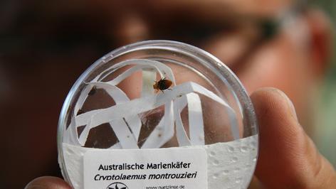 Die kleinen Killer kommen mit dem Postboten. Er liefert sie in durchsichtigen, runden Plastikdosen an, die auf acht bis zwölf Grad Celsius heruntergekühlt sind. Volker Kronmüller nimmt die Ladung mit hörbarer Freude entgegen: „Da sind sie ja, meine Raubmilben, Gallmücken und australischen Marienkäfer!“