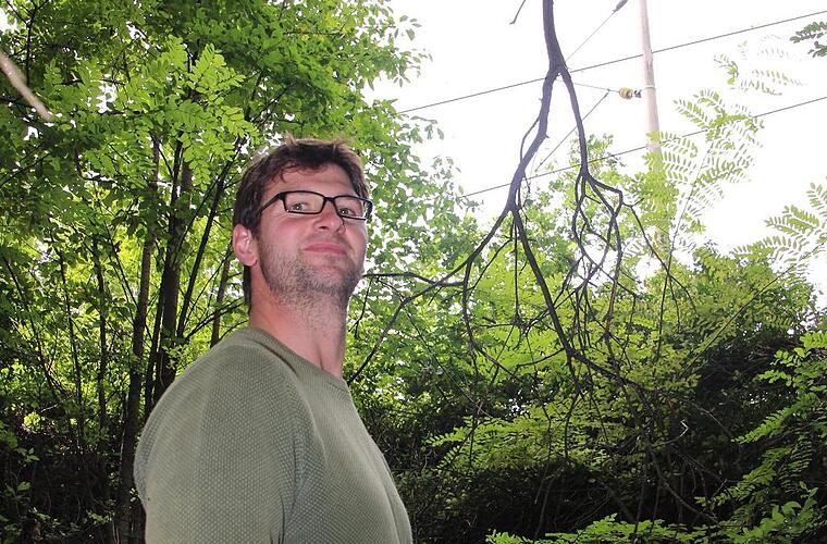Förster und Revierleiter Max Bartholl vom Amt für Ernährung, Landwirtschaft und Forsten Kitzingen hat zum Pressetermin vor Ort eingeladen. Er möchte zeigen, dass im Sickershäuser Wäldchen am See keine gesunden Bäume willkürlich der Säge zum Opfer fallen werden. Deshalb deutet er im Dickicht an der Bahnlinie auf zahlreiche Pappeln und Eichen, an denen bereits Äste abgebrochen sind oder deren Stämme sich stark geneigt haben.