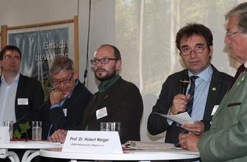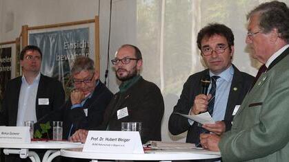 Ralf Straußberger, Waldreferent des Bund Naturschutzes, begrüßte in der Runde die Abgeordneten Otto Hünnerkopf von der CSU, Florian von Brunn von der SPD, Markus Ganserer von Bündnis 90 die Grünen und den Vorsitzenden des Bund Naturschutzes in Bayern, Hubert Weiger. Als Moderator interessierte sich Straußberger dafür, inwieweit die Vertreter sich für eine naturverträgliche Nutzung oder den Schutz von Wäldern einsetzen. Von Brunn sagte, die SPD stehe zu den Biodiversitätszielen, wolle zehn Prozent der staatlichen Wälder aus der Nutzung nehmen und verfolge die Ziele Naturschutz, forstliche Nutzung und Erholung. Das Trittsteinkonzept solle auf alle Staatswälder in Bayern übertragen werden.