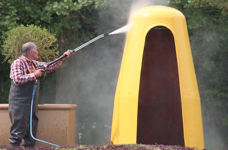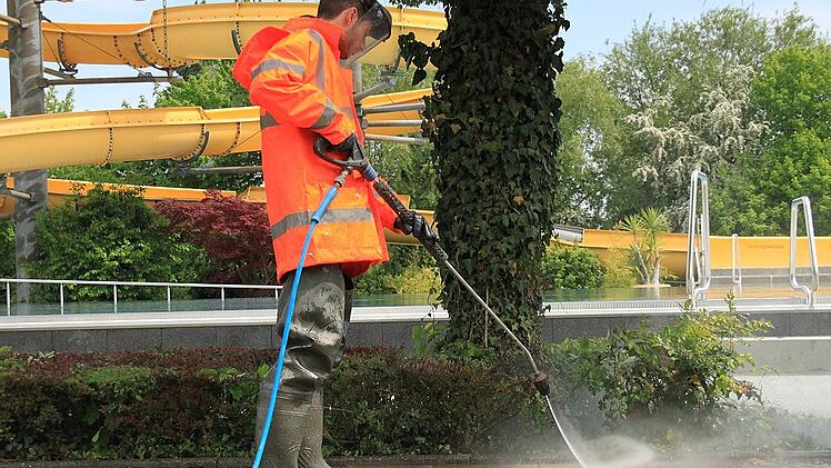 Sie arbeiten mit Hochdruck an der Eröffnung des Freibades. Genauer gesagt: Mit Hochdruckreinigern. Diese Woche säuberten Mitarbeiter die Gehwege von Pflanzen, die sich in den letzten Tagen und Wochen durch die Fugen gekämpft haben. Zeitgleich wird die Technik hochgefahren. Läuft alles nach Plan, wird das Freibad auf der Mondseeinsel am Samstag, 12. Mai, für die Saison 2018 eröffnet.