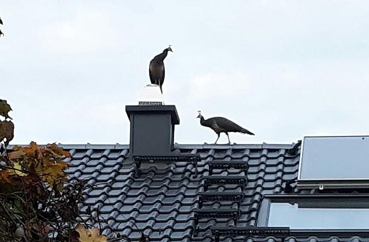 Vieles spricht also dafür, dass es sich bei den beiden Siedlungs-Pfauen um Jungtiere handelt. Drei Arten gibt es: afrikanische, solche die in Südostasien beheimatet sind und diejenigen, die in Indien, im Bereich des Himalaya leben. Letztere sind „winterfest“, überleben auch niedrige Temperaturen. Zu erkennen sind sie an einer blauen Zeichnung am Hals – so wie sie bei den beiden Ausreißern in der Siedlung zu erkennen ist.
