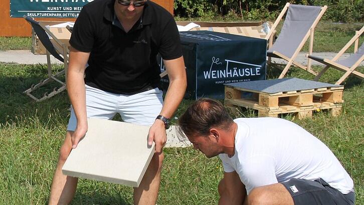 Das Weinhäusle steht nicht alleine am Skulpturenpark am Dettelbacher Mainufer. Nebendran ist eine weitere Hütte für Kunstausstellungen Dettelbacher Bürger aufgebaut. Ein paar Tische und Stühle gibt es auch schon. Liegestühle und Sonnenschirme ebenso.