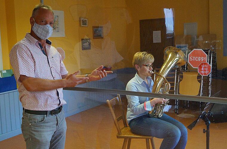 Ein Hygienekonzept wurde erstellt. Um regelmäßiges Lüften geht es darin, um die Entsorgung des Kondenswassers und um vieles mehr. Die Vereinsführung hat Desinfektionsmittel besorgt. Eine große Plexiglasscheibe aufgestellt, die Lehrer und Schüler trennt. Überall Hinweisschilder angebracht. Gleich nach dem Umrüsten des Raumes hat der musikalische Vorstand des Vereins, Siegfried Graf, gemeinsam mit den anderen Vorstandsmitgliedern und Sabine Mauckner, die die Rolle der Schülerin übernahm, ausprobiert, wie das funktioniert mit dem Einzelunterricht zu Corona-Zeiten. Wenn die Situation auch ungewöhnlich ist: Alle Beteiligten freuen sich, dass der Unterricht wieder losgehen kann.