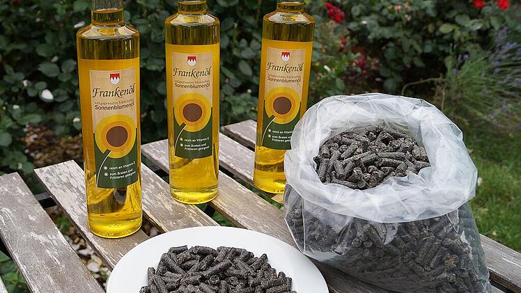 Die Flasche ziert der rotweiße Rechen, der Name verrät die Herkunft: Das leuchtend gelbe „Frankenöl“ ist ein regionales Produkt. Für die Bewohner im Landkreis Kitzingen und der näheren Umgebung könnte man sogar sagen, ein lokales Produkt. Schließlich wachsen die High Oleic Sonnenblumen, aus denen das Öl hergestellt wird, auf den Feldern im Raum Kitzingen. Genauer: Auf den Feldern der Landwirte, die sich zur „Erzeugergemeinschaft für Qualitätsgetreide und Sonnenblumenkerne Kitzingen und Umgebung“ zusammengeschlossen haben. Weite Transportwege gibt es nicht: Die Lagerung erfolgt in Kleinlangheim, die Verarbeitung in der Ölmühle in Rüdenhausen, das Öl wird dort sowie in den Edeka-Märkten verkauft.