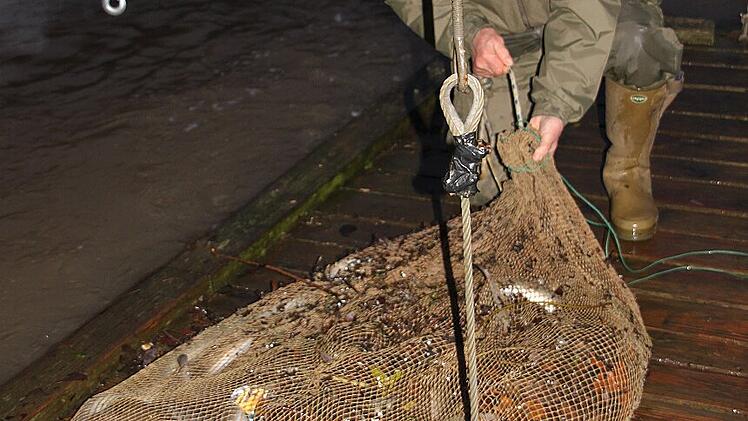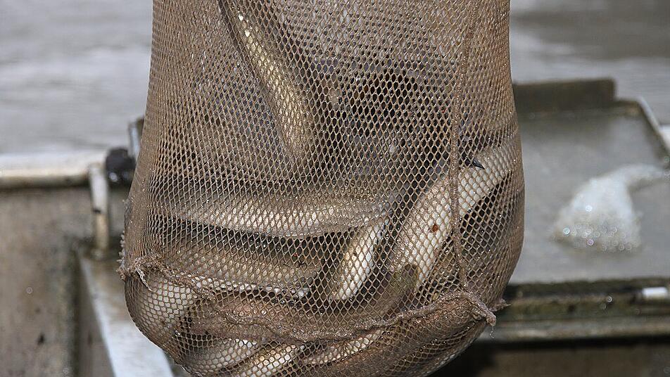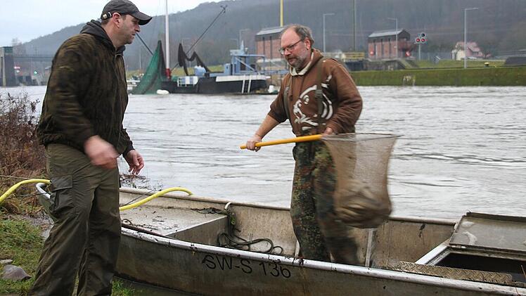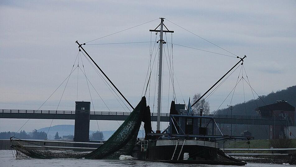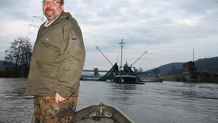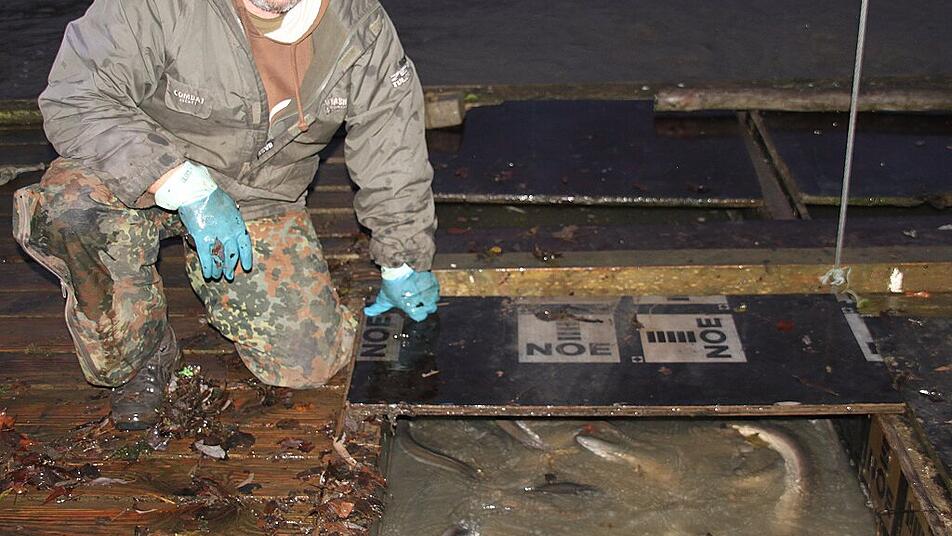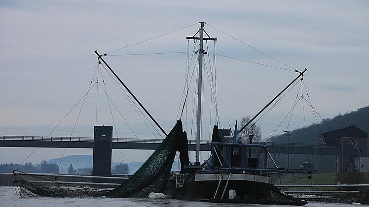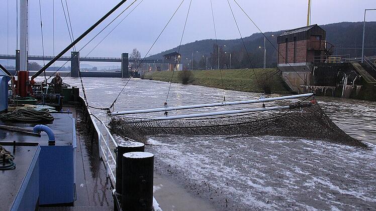 7.30 Uhr, Schleuse Harrbach, zwischen Karlstadt und Gemünden. Noch ist es dunkel. Das Schiff ist vom Ufer aus nicht zu erkennen. Nur ein paar Lichter verraten, dass dort drei Männer an der Arbeit sind. „Ohne unsere Kopflampen würden wir in der Nacht gar nichts sehen“, erklärt Greiner wenig später im Schelch. Mit dem geht es hinüber auf sein Schiff, das fest vertäut in der Strömung des Mains liegt. Detlef Greiner, Christian Schätzl und Matthias Merkl haben eine lange Nacht hinter sich. Die vierte in Folge. Wenn der Main Hochwasser führt, dann startet ihre jährliche Rettungsaktion. Bis zu fünf Tonnen Aale retten sie pro Jahr vor dem sicheren Tod.