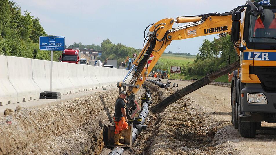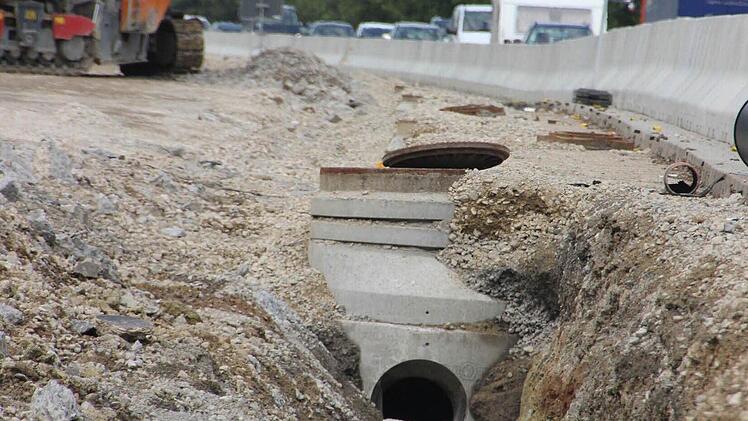Statt der früher üblichen 50 Zentimeter wird die neue A 7 einen Aufbau von 75 Zentimetern haben: Die Betondecke wächst auf 30 Zentimeter, darunter befindet sich eine ebenso dicke Schottertragschicht, die wiederum auf 15 Zentimetern Frostschutz-Gestein aufliegt. "Eine gute Entwässerung ist das A & O für die Haltbarkeit", weiß Ehmke und deutet auf die bereitliegenden Rohre und Schächte, die an den Fahrbahnseiten verlegt werden.