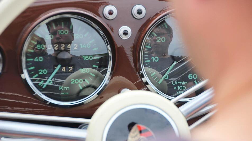 So wie Hugo Brennflecks zweiter Porsche. Der 1953 gebaute, 55 PS starke, sandgraue VA mit Metall-Cockpit ist ein ganz seltenes Cabrio. "Meine Frau war gerade auf Mutter-Kind-Kur. Deshalb hatte ich wahrscheinlich ein bisschen mehr Zeit als sonst." Der VA stand in Holland. "Wieder bin ich mit einem Fachmann hingefahren - und hab' den Wagen gleich mit zurückgenommen. Die Grundsubstanz war super."