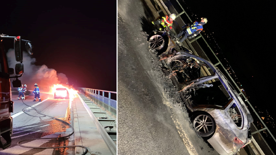Auf der A7 hatte ein BMW-Kombi Feuer gefangen. Als die Feuerwehr kurze Zeit später eintraf, stand das Auto bereits vollständig in Flammen. Die Löscharbeiten wurden auch noch von der Autobatterie erschwert. "Bei Kombis ist die Batterie so verbaut, dass es komplizierter ist, sie zu löschen", erklärt Kommandant Müller. Deshalb habe sich das Fahrzeug durch Kurzschlüsse mehrfach neu entzündet.