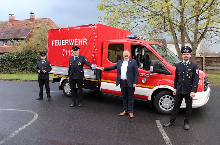 Große Freude bei der Volkacher Feuerwehr: Trotz zeitlicher Verzögerung konnten Bürgermeister Heiko Bäuerlein und Feuerwehrreferent Moritz Hornung im kleinen Kreis das neue Einsatzfahrzeug übergeben, schreibt die Verwaltungsgemeinschaft Volkach in einer Pressemitteilung. Das Vorgängerfahrzeug hatte im vergangenen Jahr die Hauptuntersuchung nicht mehr bestanden. Eine Reparatur war unwirtschaftlich, sodass ein neues Ersatzfahrzeug angeschafft werden musste.