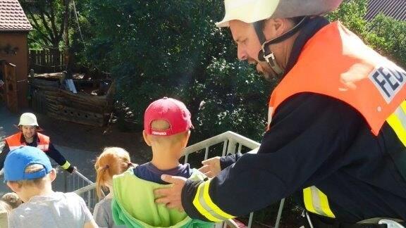 Im Juni wurde es „brenzlig“ im Kinderhaus Hüttenheim: Die Feuerwehr Hüttenheim rückte aus, um Kinder und Erzieher über die Feuertreppe retten zu können, teilt der Kindergarten mit.