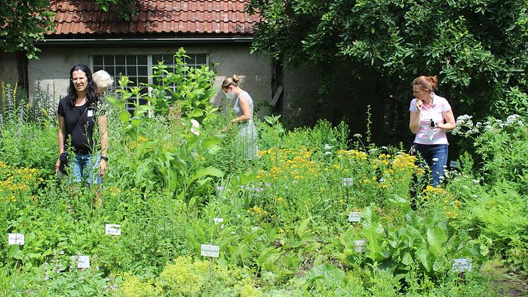 Wie man aus verschiedenen Kräutern Salben, Cremes oder Destillate macht, zeigte Gästeführerin Roswitha Dorsch im Kräutergarten. Sie hatte schon Vorbereitungen für eine Ringelblumensalbe getroffen, wobei die Blüten in Olivenöl auf etwa 70 Grad erhitzt worden waren und danach abgeseiht wurden. Damit die richtige Konsistenz der Salbe entsteht und sie weicher wird, kamen dann Bienenwachs und Lanolin (Wollwachs) dazu und das Produkt musste noch einmal erhitzt werden, "da das Bienenwachs bei 60 Grad zu schmelzen beginnt". Die Zuhörer erfuhren auch, dass die Salbe bei kleinen Verletzungen Verwendung finden kann und generell gut für die Hautpflege ist, "zum Beispiel nach der Gartenarbeit".