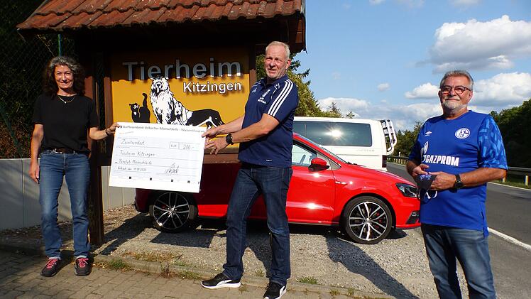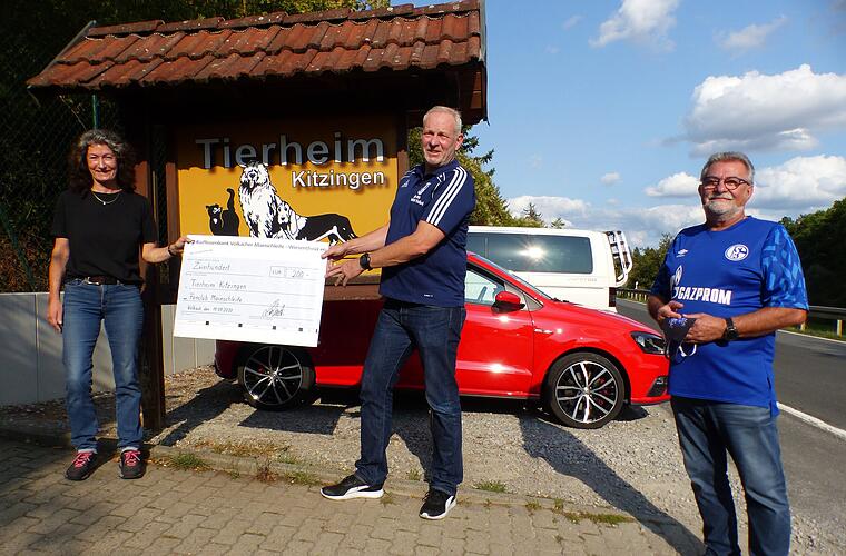 Da hat sich der Fanclub Mainschleife, eine Verbindung von Fußballfans des 1. FC Nürnberg und Schalke 04, etwas Feines einfallen lassen: Über private Kontakte des Kassier Thorsten Koslowski entwarf eine Firma Gesichtsschutzmasken aus Stoff mit dem Emblem der beiden Vereine. 250 solcher Masken wurden dann zu Beginn der Coronakrise an die Mitglieder verkauft, was zu einem Erlös von 200 Euro führte. Vorsitzender Günther Wedler hatte mit weiteren Mitgliedern die Idee, dieses Geld dem Kitzinger Tierheim zu spenden. "Wir wollten einen Verein aus der heimischen Gegend unterstützen. Da wir wußten, dass der Neubau des Tierheimes noch eine große Finanzierungslücke hat, waren wir uns sofort einig, den Tierschutzverein damit zu unterstützen." Groß war dann natürlich die Freude der Tierheimleiterin Angela Drabant, als die beiden Vorstände ihr den entsprechenden Scheck überreichten. „Das Geld kommt in unseren großen Spendentopf für den Tierheimbau. Da muss noch einges hinein“ sagte sie zuversichtlich und verweist dabei auf die Online-Spendenmöglichkeit unter dem Link http://www.leetchi.com/c/tierheim-neubau, wo man direkt auf dem virtuellen Spendenkonto landet. Der Fanclub-Vorstand Wedler plant schon, eine weitere Charge der Masken herstellen zu lassen. Wer Interesse an den Vereinstätigkeiten hat, kann sich bei ihm unter der Mailadresse „guenther.wedler@t-onlline.de“ melden.