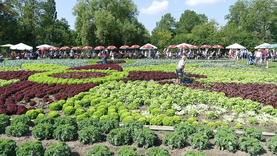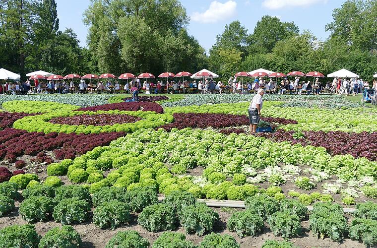 Eineinhalb Monate ist es her, dass rund 20 Helfer am Standort die Salatblume setzten. Diese besteht aus etwa 10 000 Pflanzen. Kopfsalat, Eichblatt, Lollo-Rosso, Endivie, Batavia, Salanova und Eissalat reiften sechs Wochen lang in Reih und Glied, bis am Festtag die Erntemesser gezückt wurden.