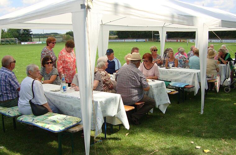 Bei herrlichem Sommerwetter mit verträglichen Temperaturen konnte programmgemäß der Grillnachmittag des VdK Ortsverbandes Kitzingen am Sportheim des TSV Hohenfeld stattfinden. Das Frauenteam des TSV überraschte wieder mit selbstgebackenen Kuchen und einer Auswahl von Salaten, die am Spätnachmittag zu fränkischen Bratwürsten und Steaks gereicht wurden. Eingangs begrüßte die Vorsitzende Elvira Kahnt die VdK'ler und Gäste, Vorstandsmitglieder sowie die örtliche Stadträtin Hiltrud Stocker. Das Trio "ALF" mit dem Vorstandsmitglied Max Michelsen sowie Sabine und Dany Strele aus Sonthofen, sorgte für gelungene musikalische Cocktails. Viel zu schnell verging die Zeit dieser Begegnung bis zur abendlichen Rückfahrt mit dem Bus.