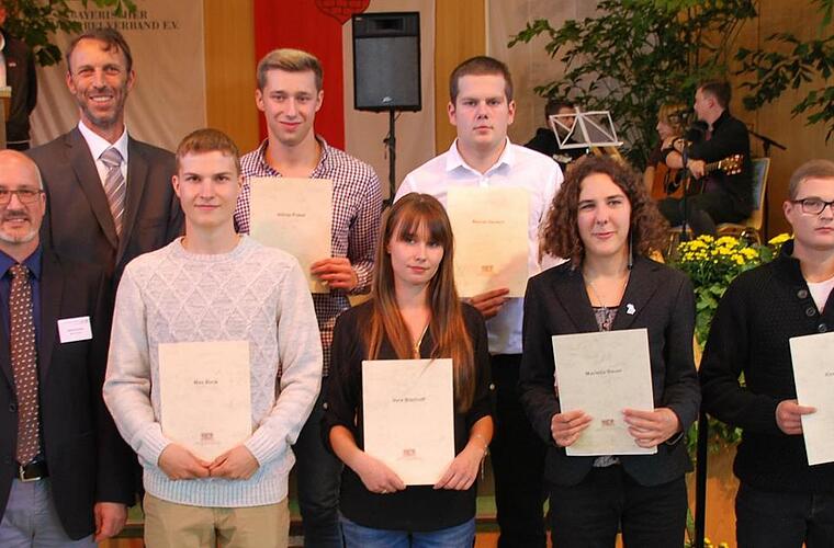 In Gochsheim (Landkreis Schweinfurt) wurden 87 unterfränkische Lehrlinge der Gärtnerberufe freigesprochen. Aus der Hand von Nikolai Kendzia (vorne links) vom Amt für Ernährung, Landwirtschaft und Forsten in Kitzingen, das für die Gärtnerausbildung in ganz Unterfranken und Oberfranken verantwortlich zeichnet, und Herbert Eichelmann (hinten links) vom Landesgruppenvorstand Zierpflanzenbau des Bayerischen Gärtnereiverbandes erhielten aus dem Landkreis Kitzingen (jeweils von links), vorne: Max Bock, Vera Bischoff, Mariella Sauer, Kim Rudolph, hinten: Niklas Pobel und Marcel Seufert ihre Gesellenbriefe. Verhindert waren Nina Braun, Simon Röll, Julian Wald und Maximilian Barthelmeß. Sie bekommen das Dokument per Post zugesandt. 1#googleAds#100x100