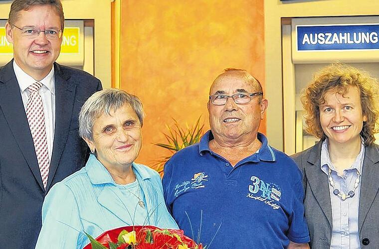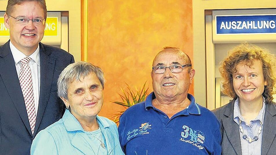 Der Gewinnerin und ihrem Ehemann Ludwig (Bildmitte) gratulierten der Prokurist und Bereichsleiter Peter Dill und die Kundenberaterin Claudia Seipel. Nachdem im vergangenen Jahr Gewinne von über 127 000 Euro an Sparer der VR Bank Kitzingen ausgeschüttet wurden, haben deren Kunden auch dieses Jahr schon Grund zur Freude gehabt und bis August rund 85 000 Euro gewonnen.
