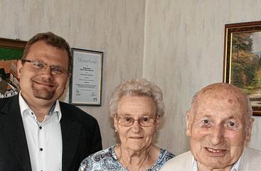 Gerhard und Maria Berthold aus Reupelsdorf sind seit 60 Jahren verheiratet. Zu ihrer diamantenen Hochzeit gratulierte Wiesentheids Bürgermeister Werner Knaier besonders gerne, wuchs er doch als Nachbar der Bertholds auf und kennt die Familie von klein auf. Trotz mancher, vor allem gesundheitlicher, Probleme haben sich die Bertholds ihren frohen Mut bewahrt. Über 20 Operationen musste Gerhard Berthold bereits über sich ergehen lassen, zehn Jahre nach der Hochzeit begannen seinen gesundheitlichen Probleme. „Zusammenhalten in guten, wie in schlechten Tagen, alle Höhen und Tiefen annehmen“ gilt für das Paar als Lebensmotto.