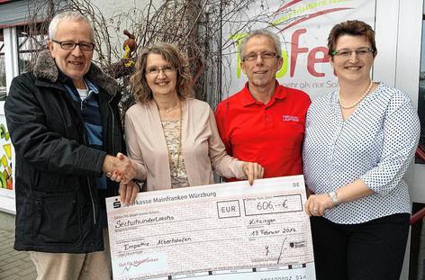 Kitzingen beim Silvesterlauf für einen guten Zweck. Empfänger war diesmal das Projekt „Lernenergie des Vereins Empathie – helfen mit Herz und Verstand“ aus Albertshofen mit seiner Vorsitzenden Hildegard Töpfer. Seit zehn Jahren kümmert sie sich zusammen mit dem Verein „Dedunu“ um Kinder in Sri Lanka. Dedunu baute ein Waisenhaus auf. Aber auch in der Region Kitzingen ist Empathie aktiv. Hier geht es aktuell um Probleme mit der Frühstücks- und Pausenbrotversorgung von Schul- und Kindergartenkindern. Zwei Pilotprojekte in Kitzinger Schulen stehen kurz vor ihren Start. Sind räumliche Möglichkeiten in der Schule vorhanden, könnte ein Frühstück vor Schulbeginn angeboten werden. Das alles unterstützt das TGK-Laufteam. Beim Silvesterlauf kamen 306 Euro zusammen. Das Organisationsteam vom Schwanberglauf packte 300 Euro darauf, teilt Hartmut Gless von der TGK mit. Im Bild bei der Spendenübergabe: Abteilungsleiter Georg Will (von links), Hildegard Töpfer, stellvertretender Abteilungsleiter Hartmut Gless und Miriam Töpfer.