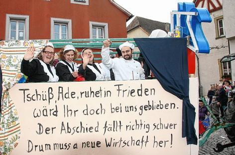 „Viel gute Laune und viel guter Wein“, lautete die Losung der Winzer auf dem ersten Wagen (im Bild), doch kurz danach machte sich eine andere Gruppe Sorgen um ein „Wirtshaussterben in Iphouf“. Sie bedauerten, dass das Gasthaus zum Hirschen seinen Gastwirtschafts-Betrieb eingestellt hat und forderten: „eine neue Wirtschaft muss her“.