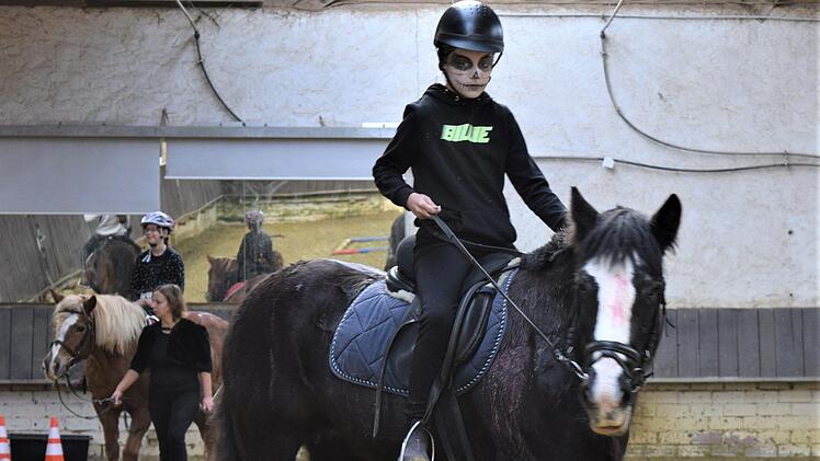 Düster war es am Sonntagmittag in der Reithalle. Ist das Blut, was der kleinen Tinkerstute Queeny über den Kopf läuft? Choco's Fell scheint auch ganz Schleim verschmiert und der Haflingerdame Moni läuft eine Absonderung über den Rücken. Was ist passiert? Ach ja - es ist Halloween. Diesen Brauch brachten irische Einwanderer einst in die USA, mittlerweile wird er auch in Deutschland begangen und so auch im Reitverein Dettelbach. Die Jugendvertretung hatte sich ein tolles Programm unter diesem Motto ausgedacht. Erst wurden die Pferde gruselig geschminkt, dann konnten die Teilnehmer und Teilnehmerinnen einen Kürbis schnitzen. Den Höhepunkt stellte ein Geschicklichkeitsparcours im Halloween-Stil dar. Die Kids, ebenfalls geschminkt und kostümiert, hatten viel Spaß und gaben alles.
