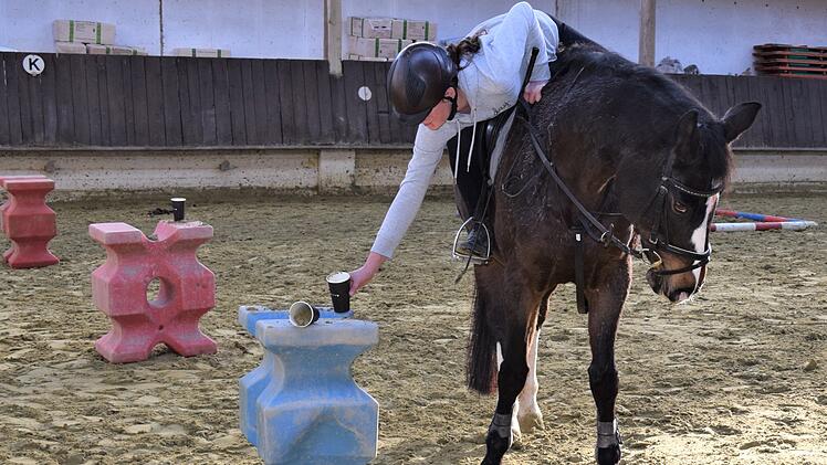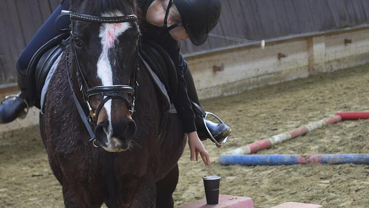Der Parcours bestand aus einem Slalom durch mehrere Pylonen, ohne dabei die aufgesetzten Tennisbälle abzuwerfen; dann Parade in einem Stangenviereck; weiter zum Becherfüllen an drei Stationen; anschließend Tausch der Reitgerte gegen den Zauberbesen und Aufgabeln eines Pylons. Die letzte Aufgabe zum Endspurt erforderte viel Gleichgewichtssinn durch das Absteigen vom Pferd direkt auf Stangen, ohne den Boden zu berühren, und dann entlang balancieren. Das war gar nicht so einfach. Aber alle schafften den Parcours ohne größere Probleme und zum Abschluss war noch Zeit, sich bei Saftcocktail, Keksen und Kuchen zu stärken. Inzwischen war auch dem Grau des Vormittags strahlendem Sonnenschein gewichen und der Spuk war vorbei.